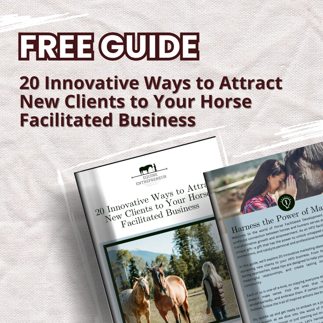 Download “20 Innovative Ways to Attract New Clients into Your HFD Business”, a free guide filled with creative and practical marketing ideas to help you grow your horse facilitated business with confidence and authenticity.